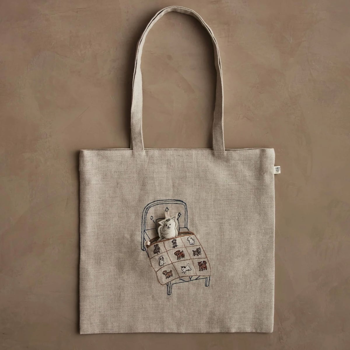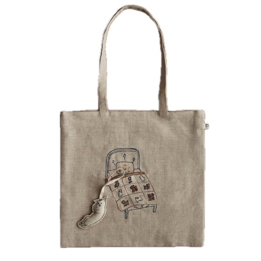 リネン素材のトートバッグに犬柄のキルトが掛けられたベッドが刺繍されています。