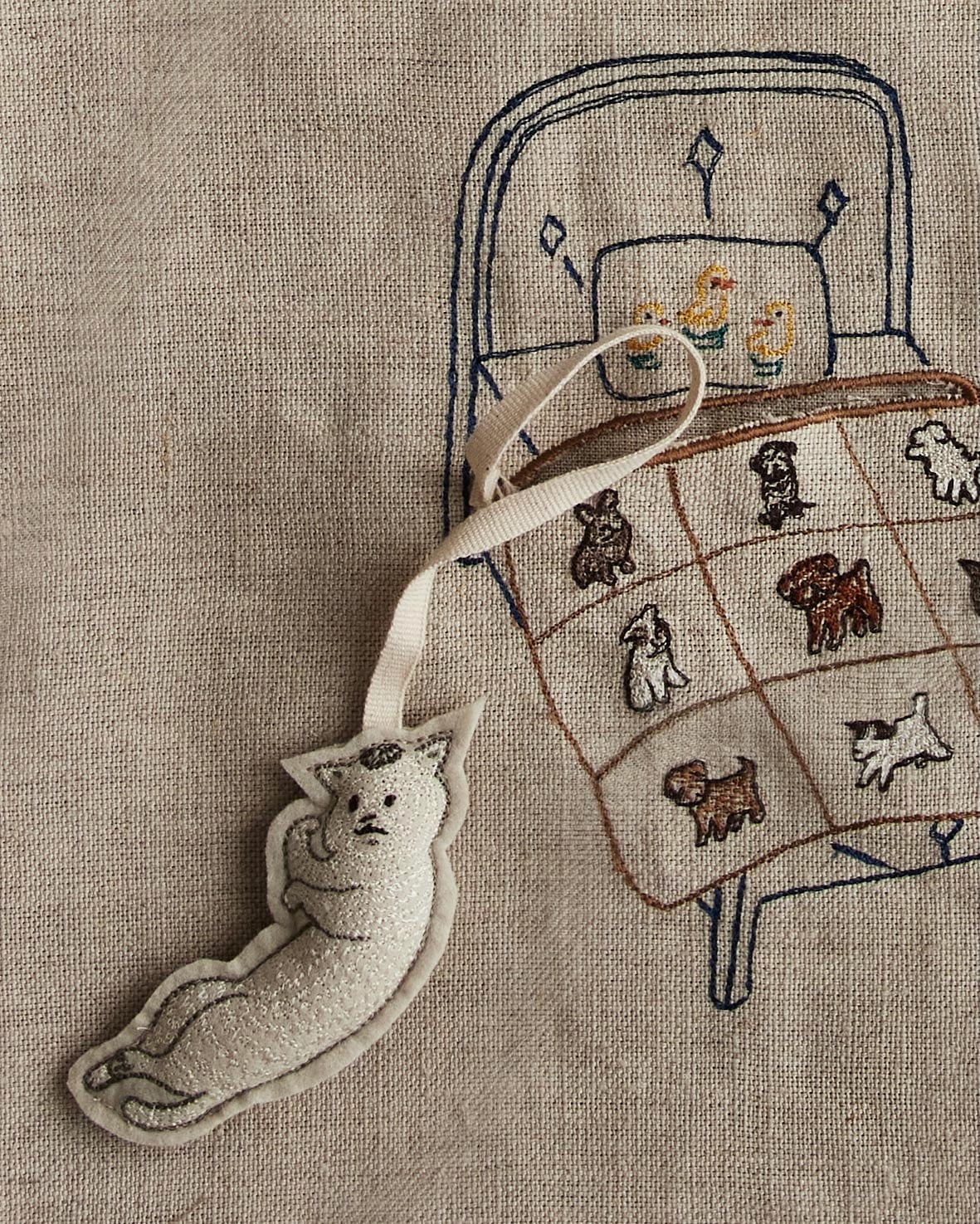 ベッドにはポケットが付いていて、フェルト素材に刺繍された猫村さんが出入りします。