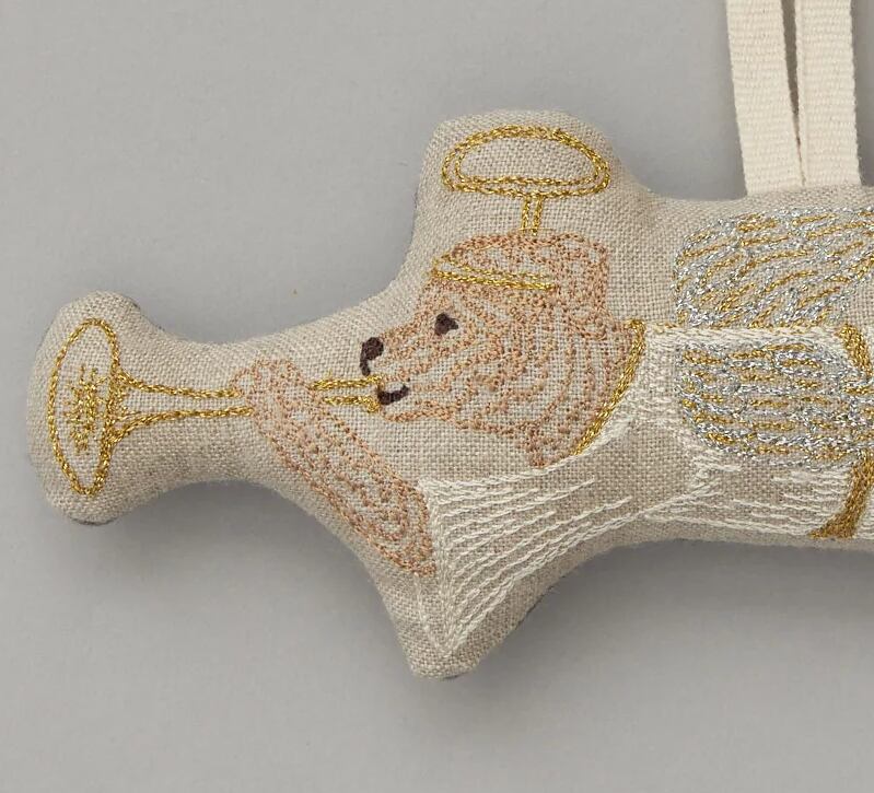 Bark… wait we mean Hark! Angel Dog plays a tune on a gold horn to signal Christmas morning. Embroidered in metallic gold and silver threads.